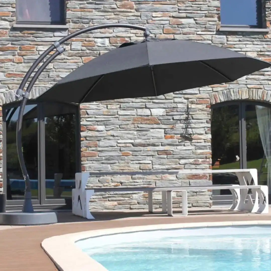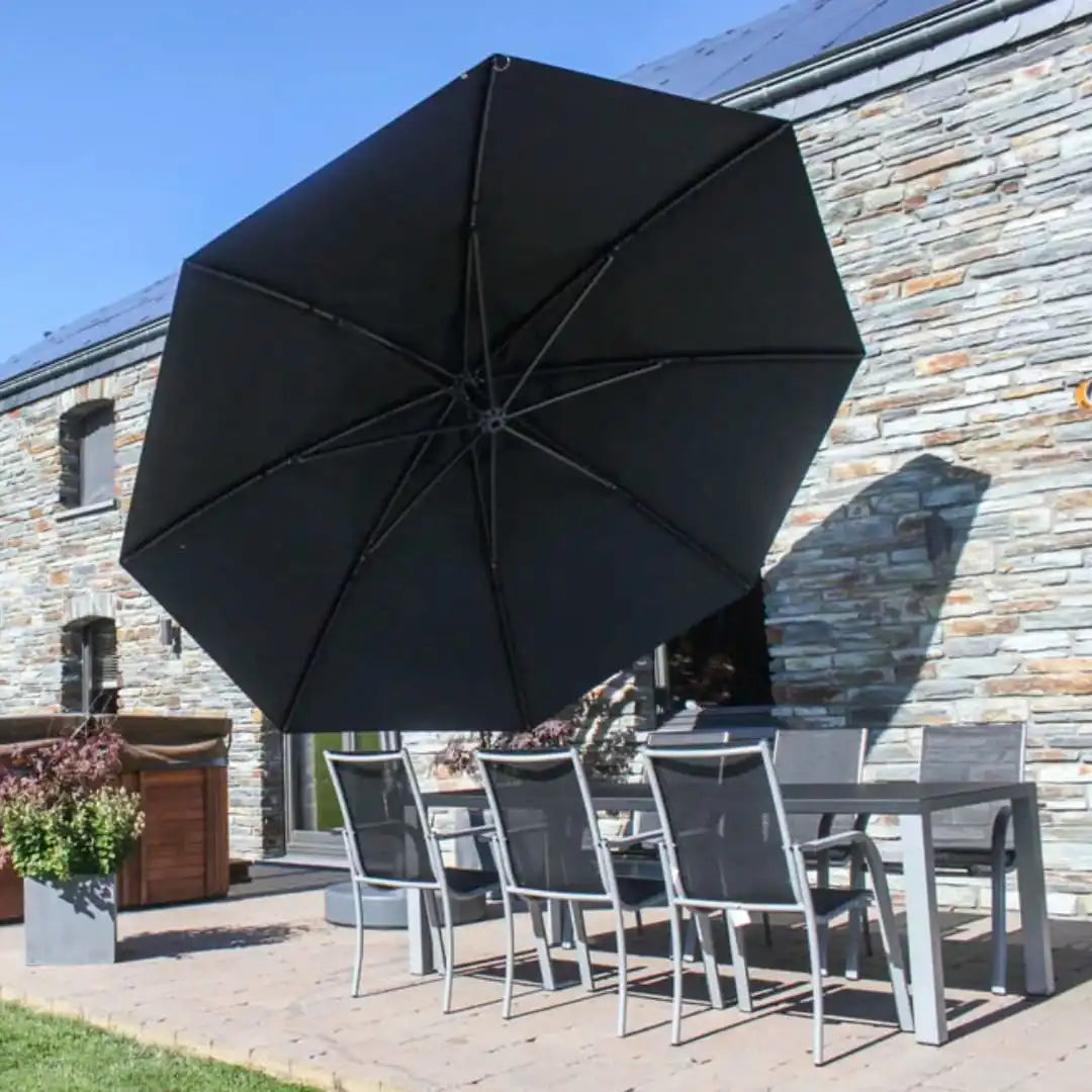 Enjoy a shaded spot during the summer months with the comfort of the Auréa Flex 360 offset parasol. This premium-quality parasol protects you from the sun and also filters harmful UV rays (LSV 50+). The Auréa Flex 360 rotates 360°, allowing it to easily adjust to the sun's position. In addition, it can be tilted up to 45°. A locking latch allows you to fix the rotation as needed.