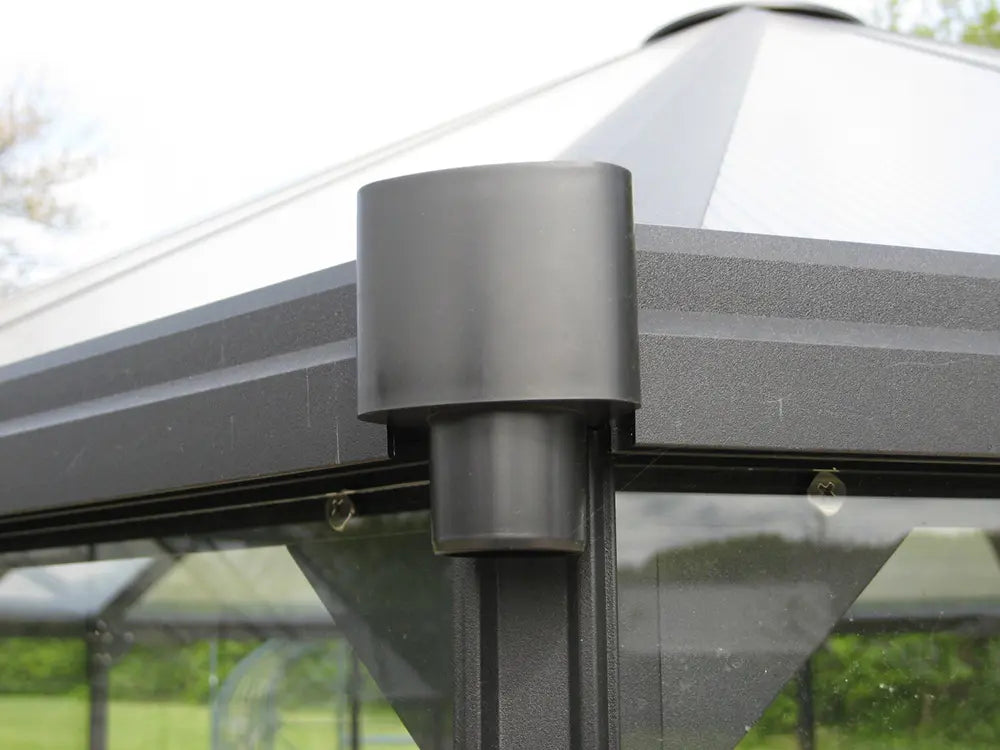 The walls are made of 3 mm clear safety glass, providing an unobstructed view of the garden. The glass is securely fixed with durable black plastic strips running the full length of the windows. The roof is equipped with 6 mm twin-wall polycarbonate panels, UV-stabilized to protect plants from harmful rays while ensuring excellent light transmission.