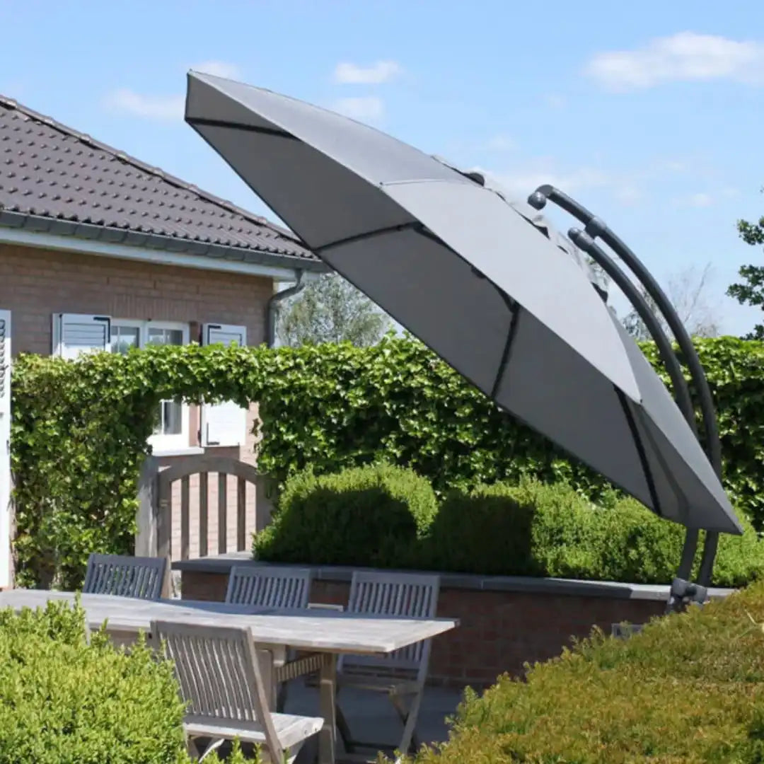 Enjoy a shaded spot during the summer months with the comfort of the Solena 420 ShadeFlex offset parasol. This premium-quality parasol protects you from the sun and also filters harmful UV rays (LSV 50+). It can rotate 360°, making it easy to adjust to the sun’s position throughout the day. Additionally, it can be tilted up to 45°, and a locking latch lets you fix it in place.
